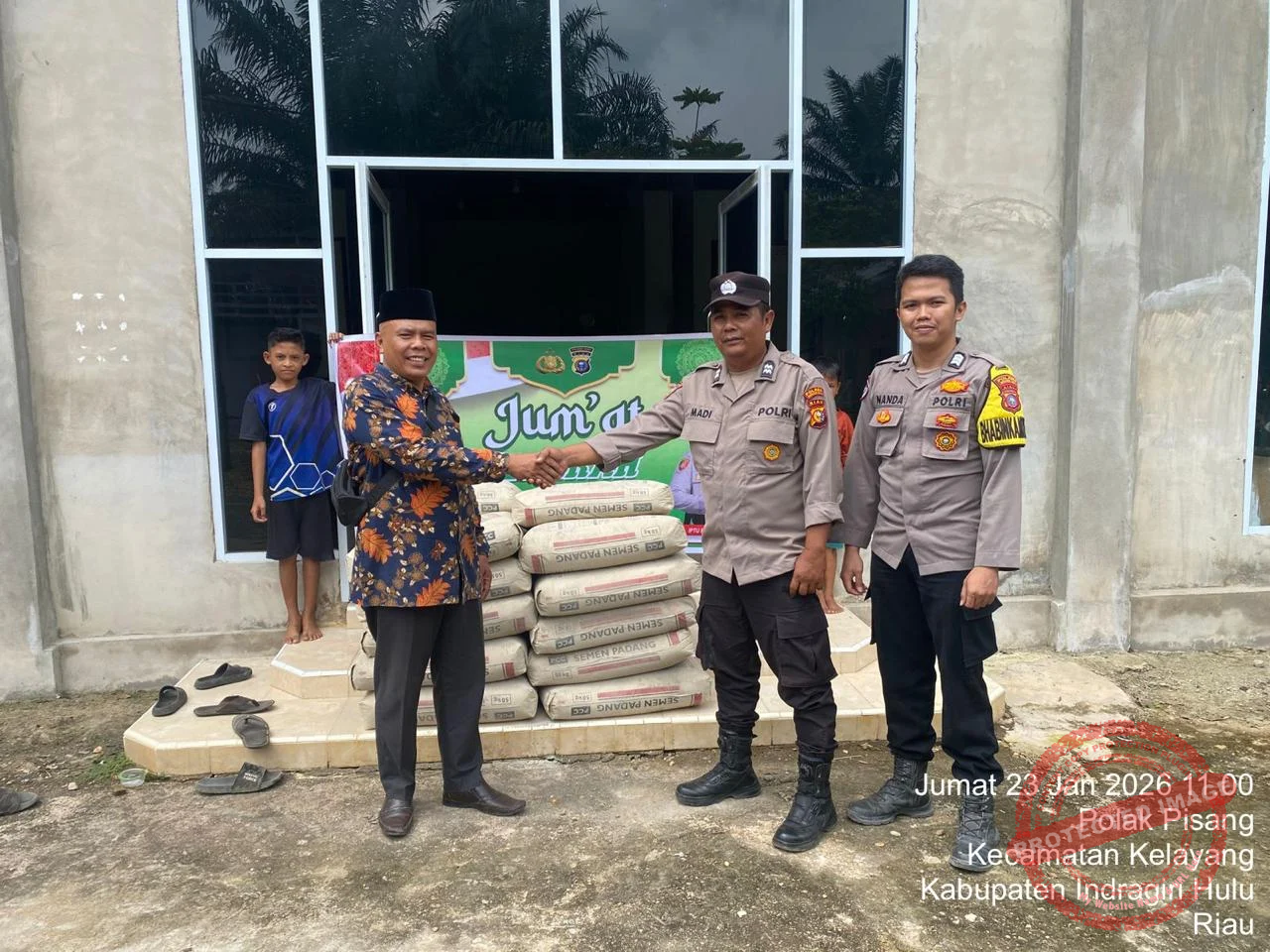 Kapolres Inhu melalui Kapolsek Kelayang, IPTU Rudi Syahputra, S.H., M.H., menyerahkan bantuan berupa 15 sak semen yang diterima langsung oleh perwakilan pengurus masjid, Bapak Saprianto (56).